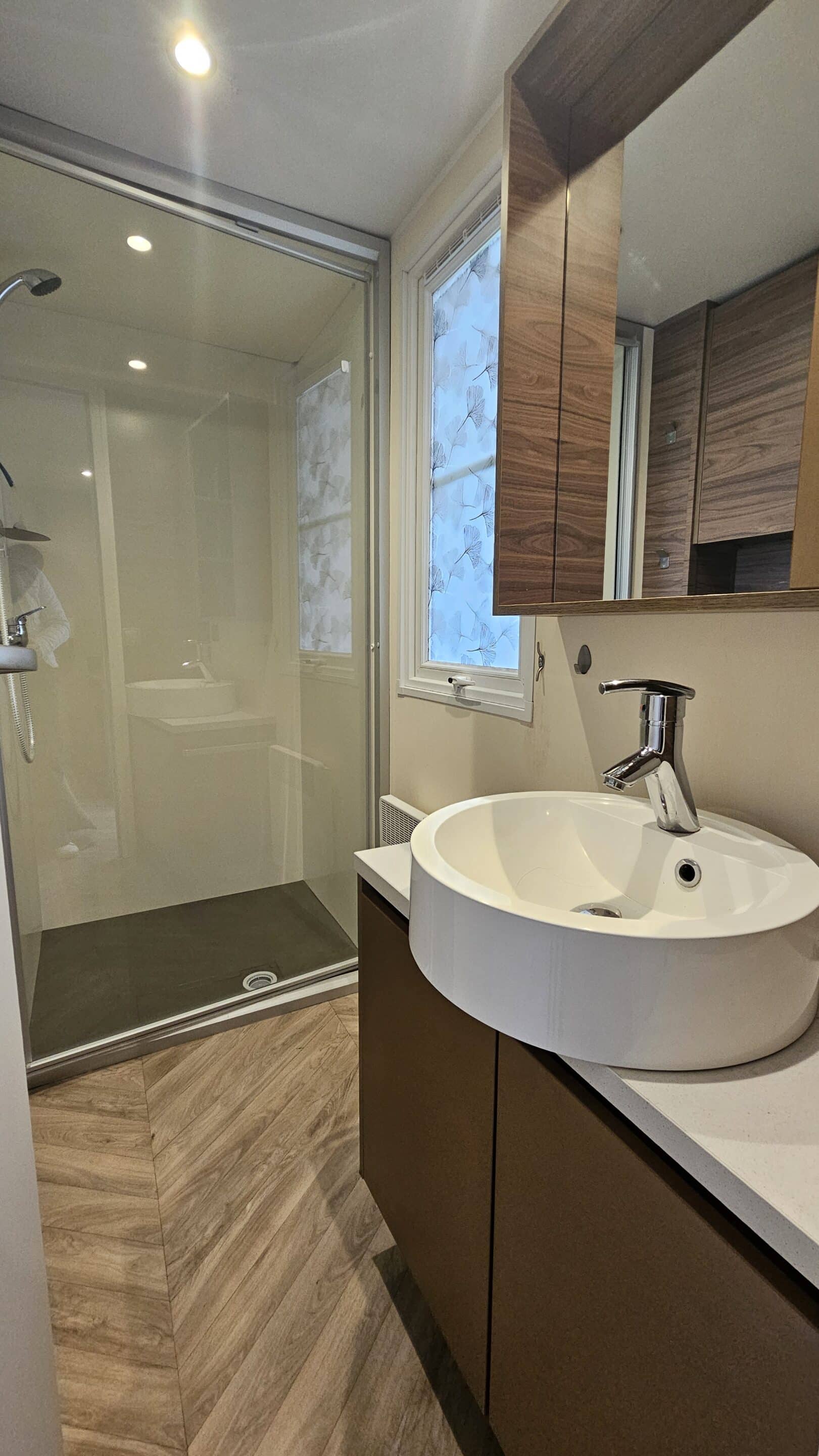 Découvrez ce mobil-home IRM Long Island 3 chambres, alliant confort et modernité, installé sur une parcelle de 154 m² délimitée par des haies végétales, à deux pas de la piscine couverte et chauffée du Camping Les Cerisiers, ouvert toute l’année, idéal pour profiter du confort d’une résidence secondaire en toutes saisons ou pour en faire votre résidence principale.