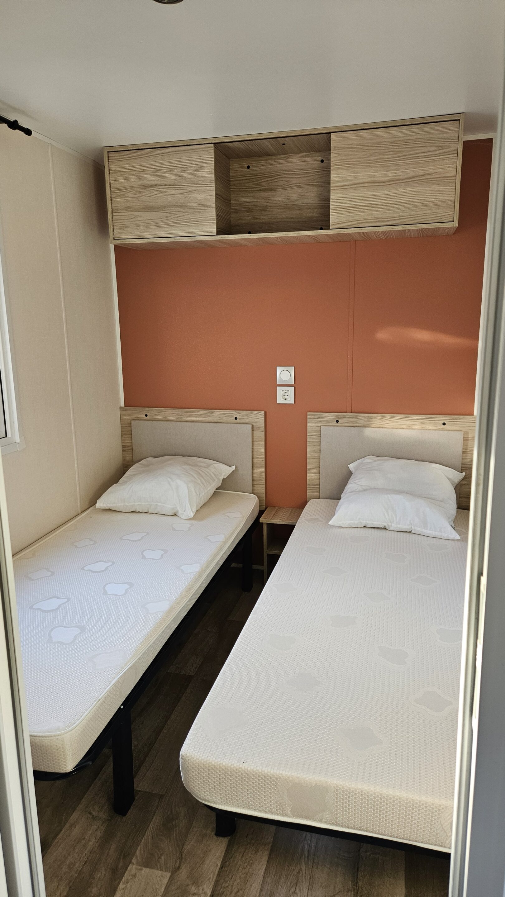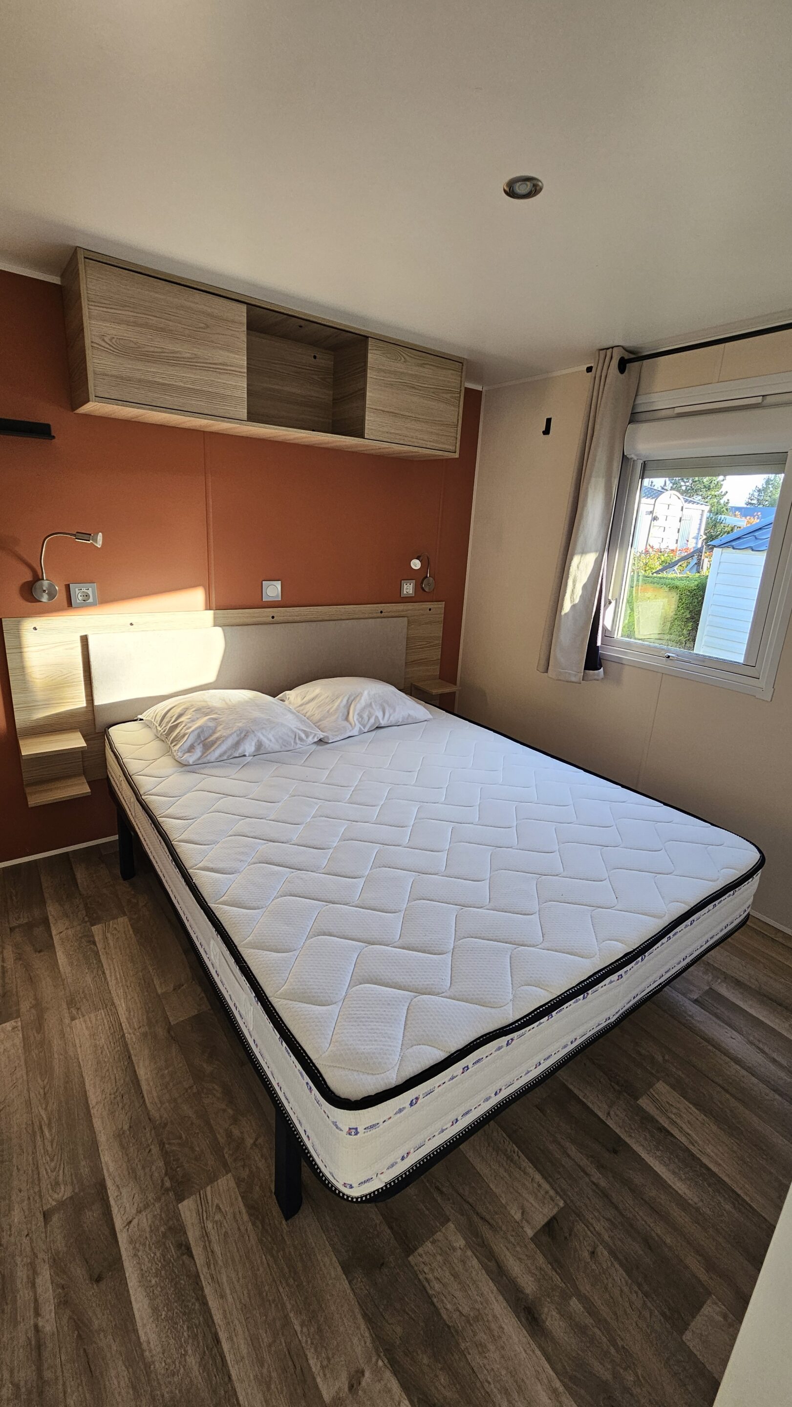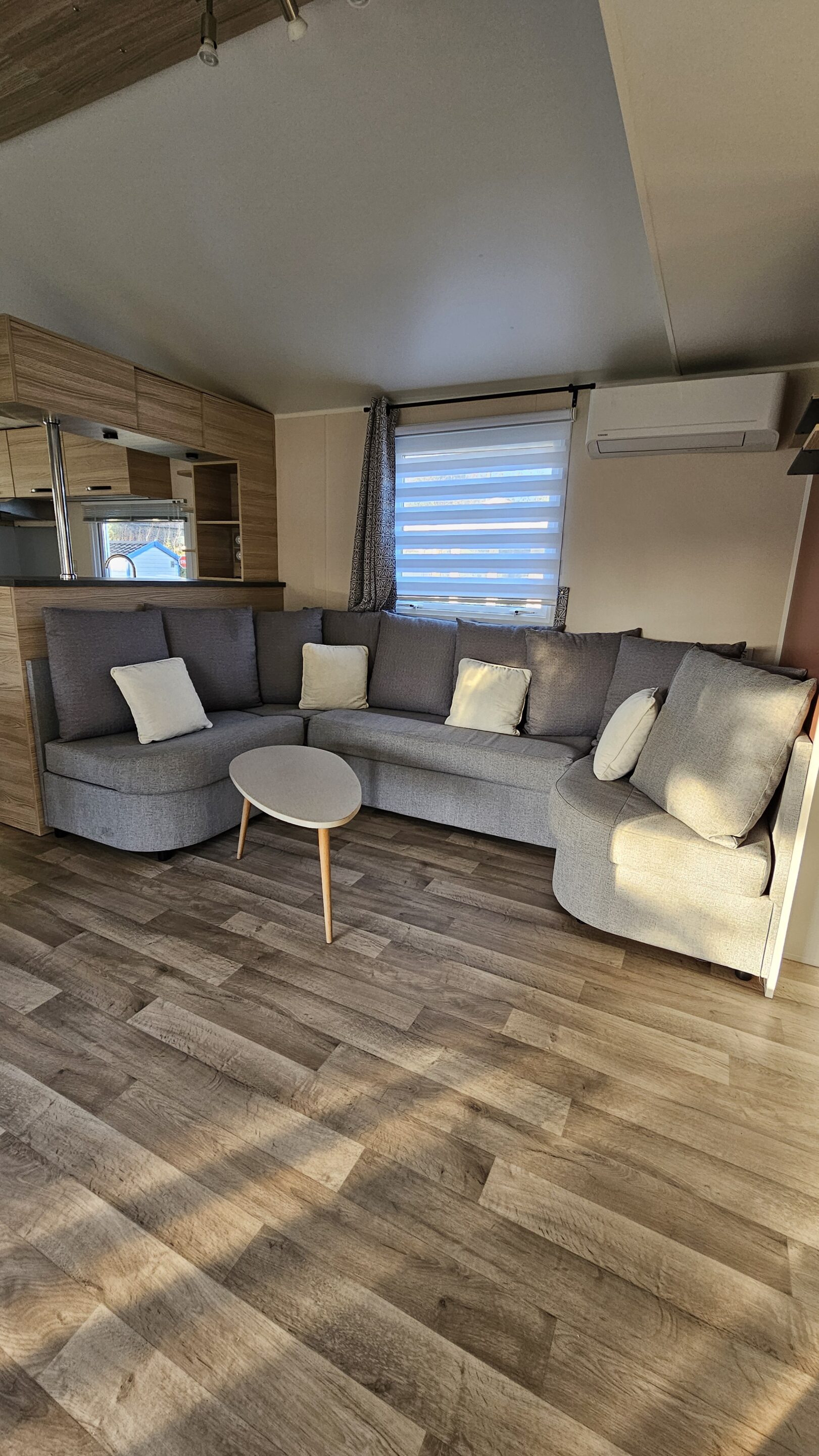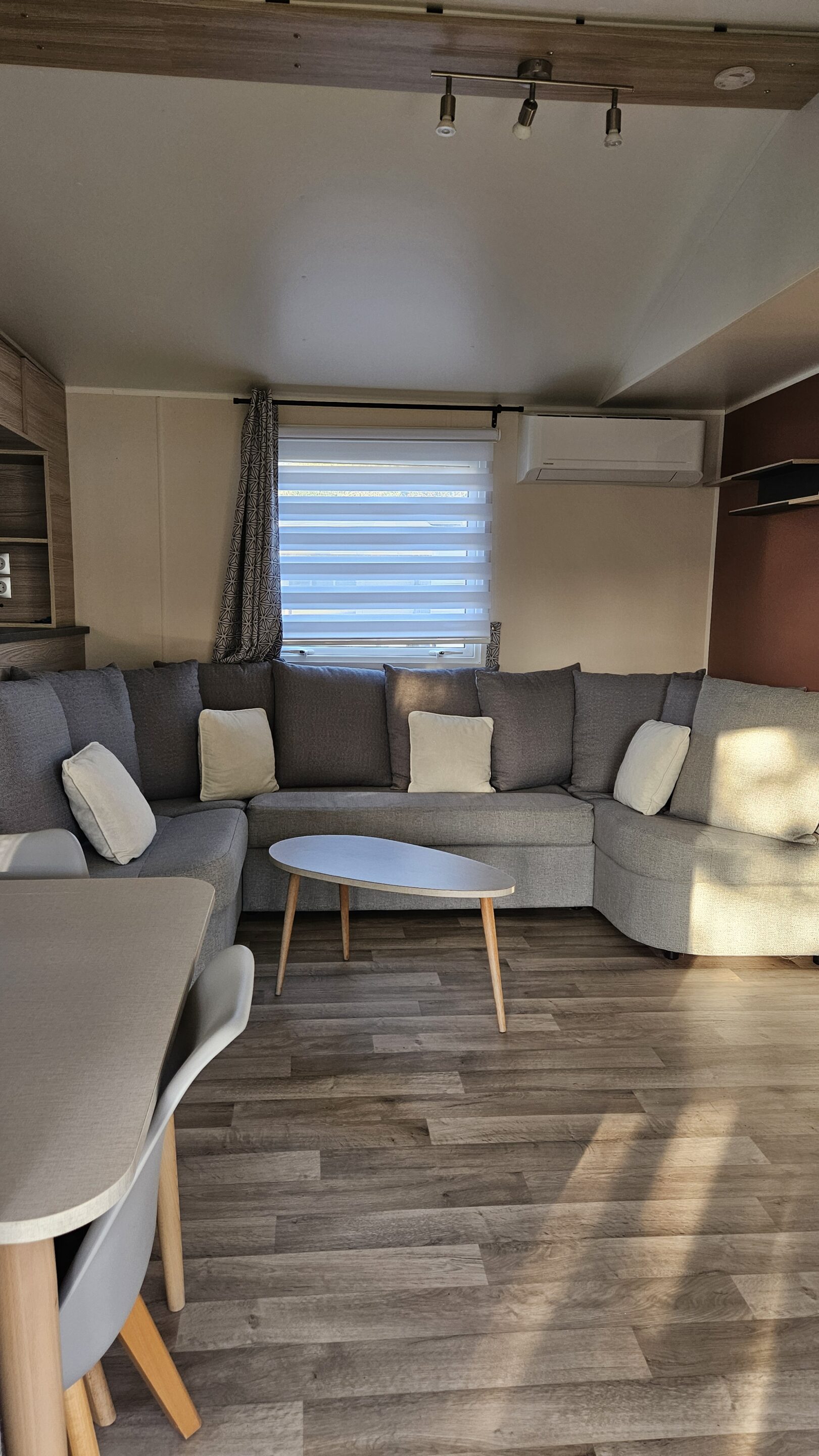 Surface généreuse (~40 m²) pour un mobil-home 2 chambres : plus de confort que les formats compacts.
