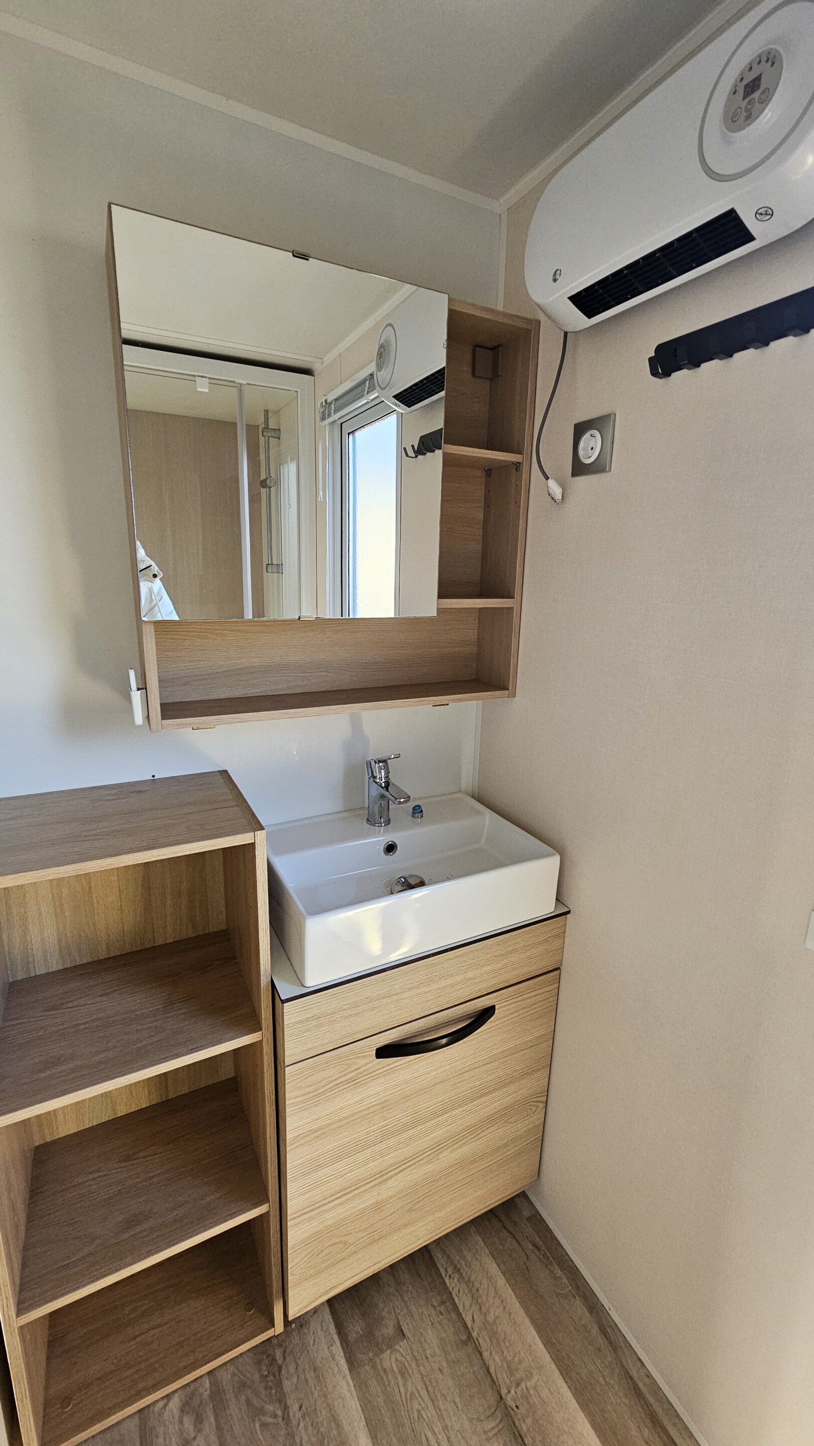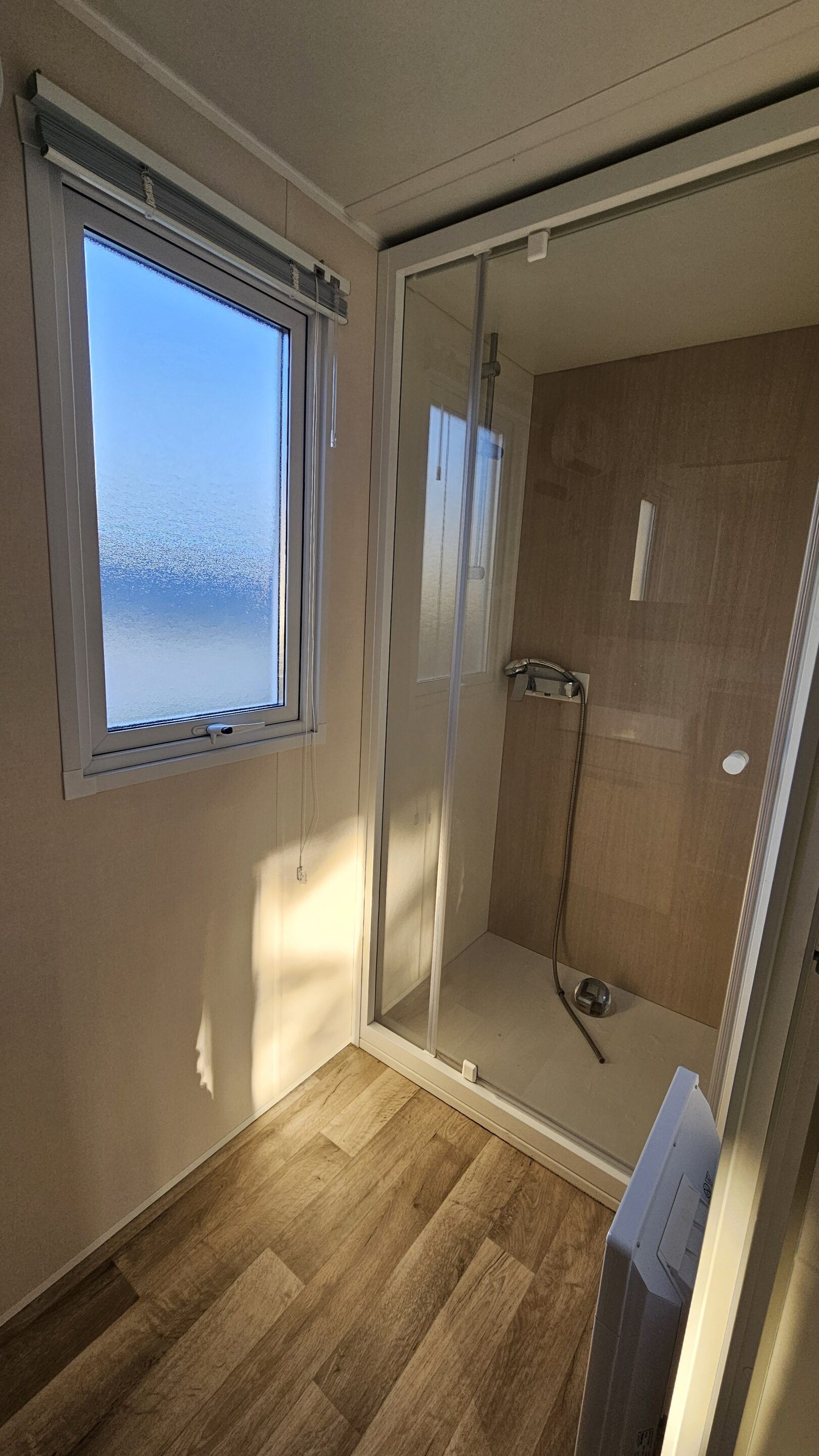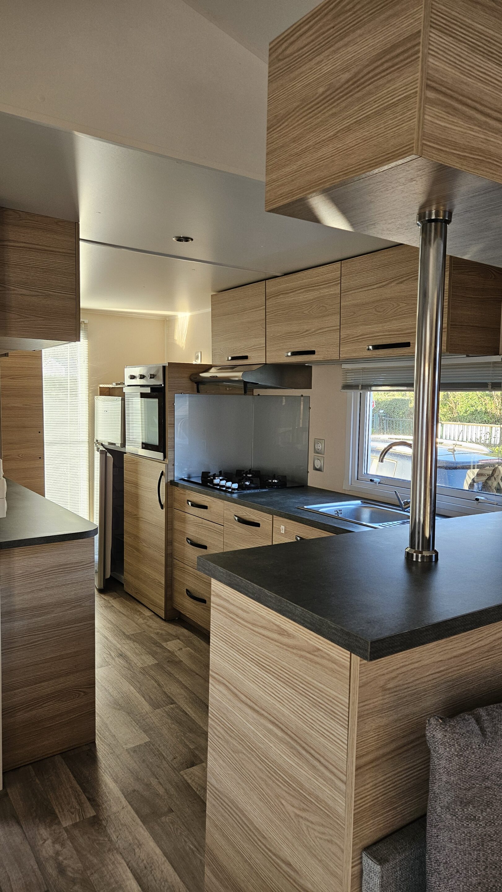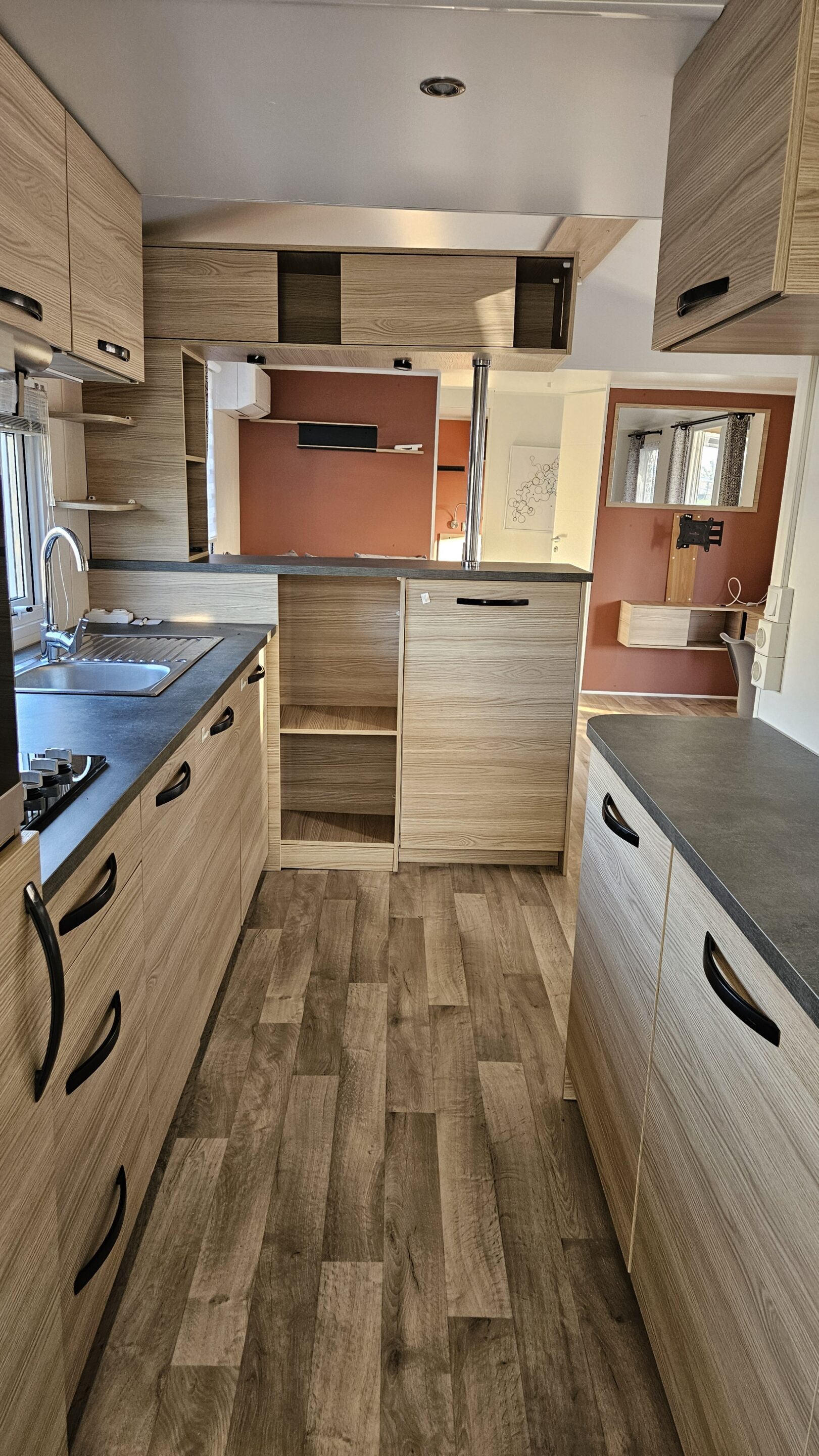 Surface généreuse (~40 m²) pour un mobil-home 2 chambres : plus de confort que les formats compacts.