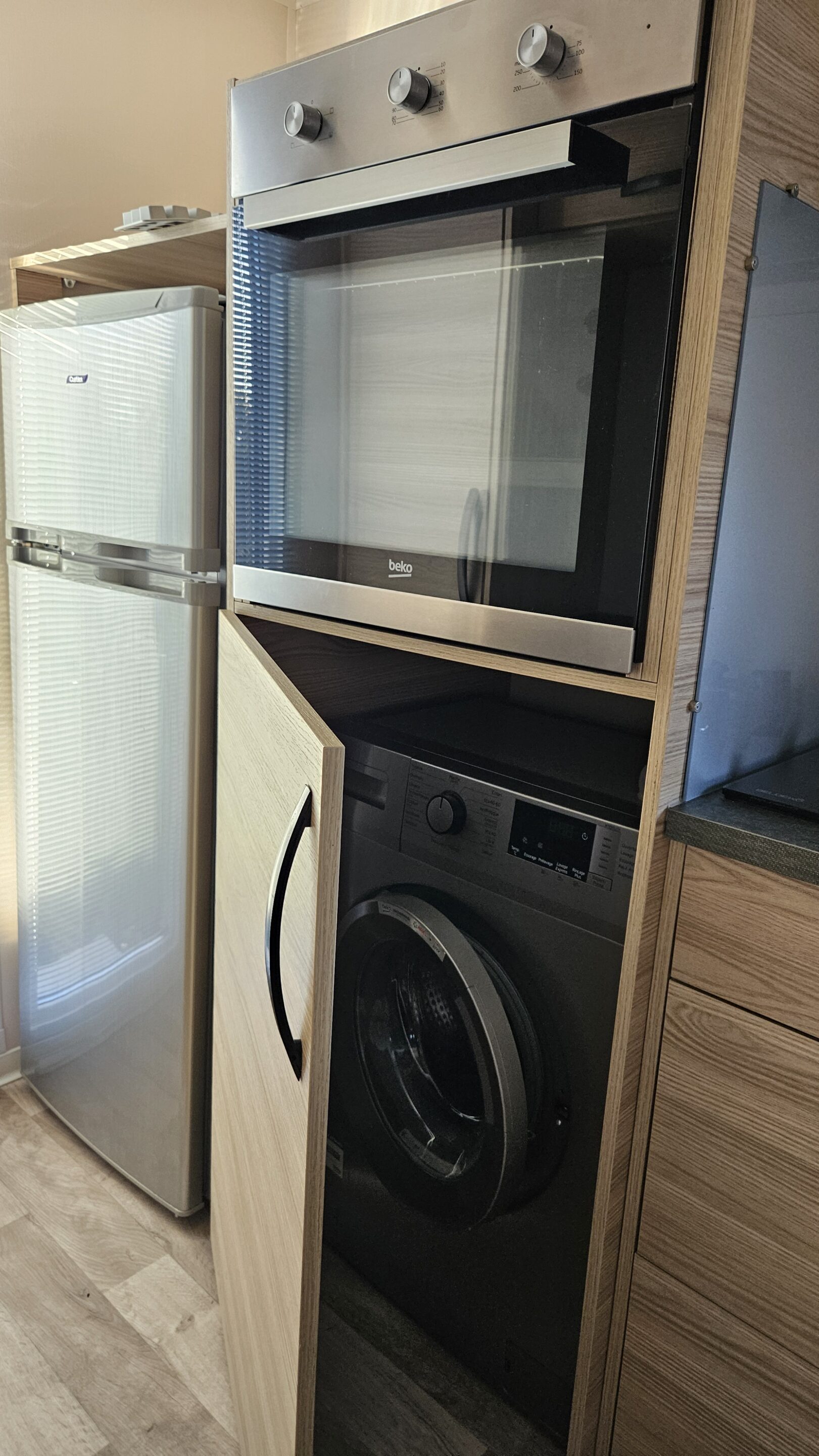 Cuisine fonctionnelle et lumineuse : nombreux rangements, retours bar, fenêtre au-dessus de l’évier. Réfrigérateur congélateur, Four et Lave Linge